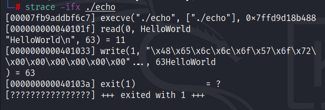 apt-get install strace로 툴을 다운받아준다. 디버깅을 하기 위해서 strace 로 시스템콜과 관련한 내용을 살펴보도록 도와주는 도구, 어떠한 프로그램이 있을 때 그것과 유사한 프로그램 만들 때도 사용하는 유용한 도구이다. strace -ifx ./echo를 통해 디버깅 과정을 알 수 있다.