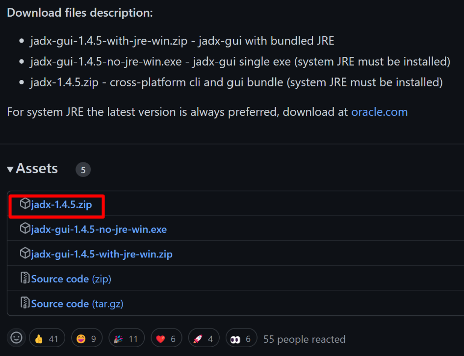 jadx는 Git Release에서 원하는 버전을 다운받아서 사용하시면 됩니다.