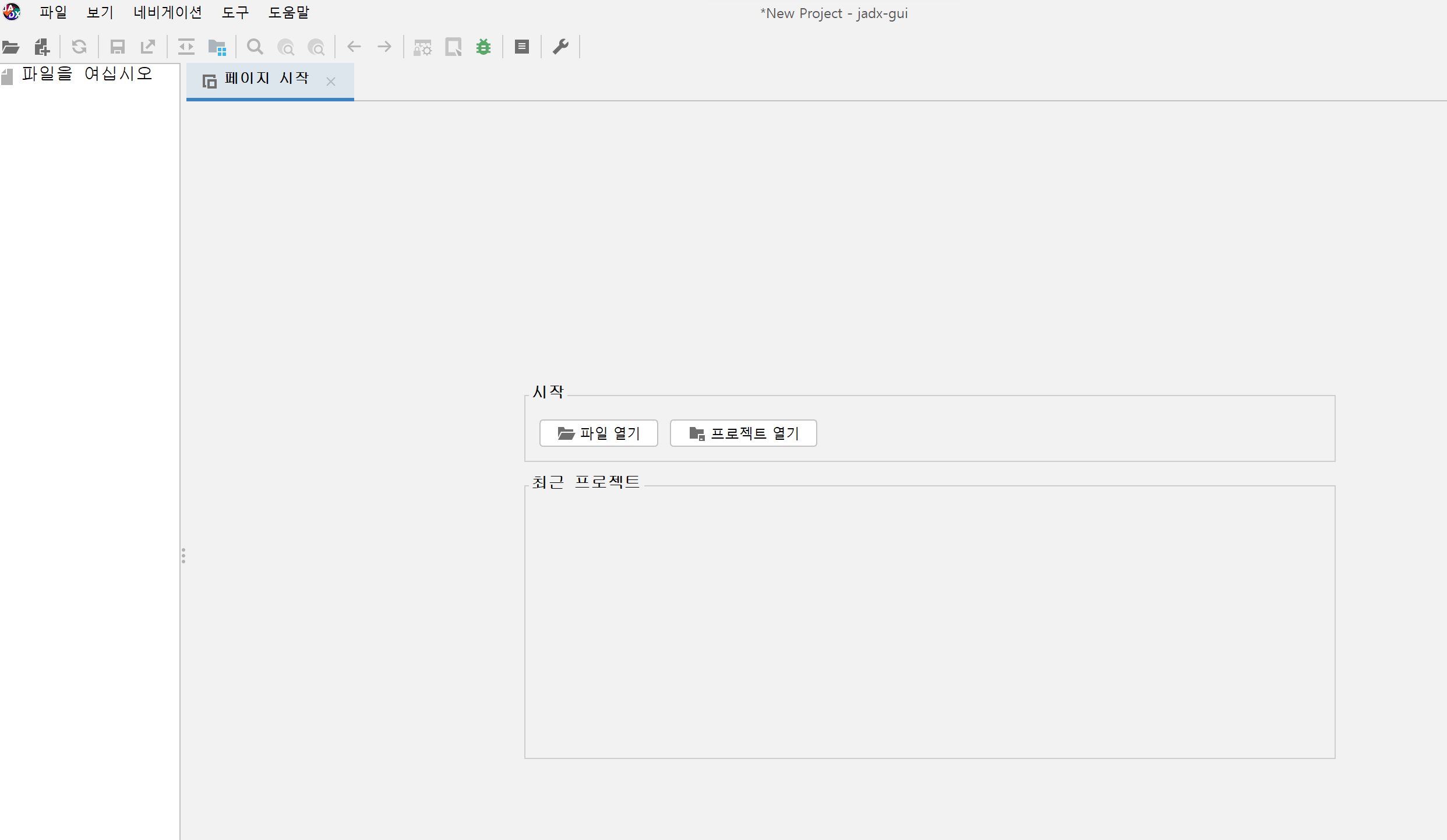 jadx-1.4.5 > bin > jadx-gui.bat 해당 배치 파일을 실행하면 아래처럼 성공적으로 작동하는 것을 알 수 있다.