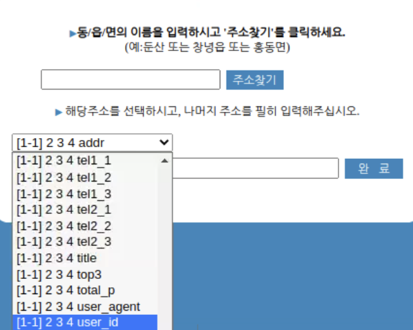 해당 주소 찾기의 데이터베이스의 칼럼은 총 5개 인 것을 확인했으므로, 앞으로의 UNION은 5개로 한정하여 검색한다.