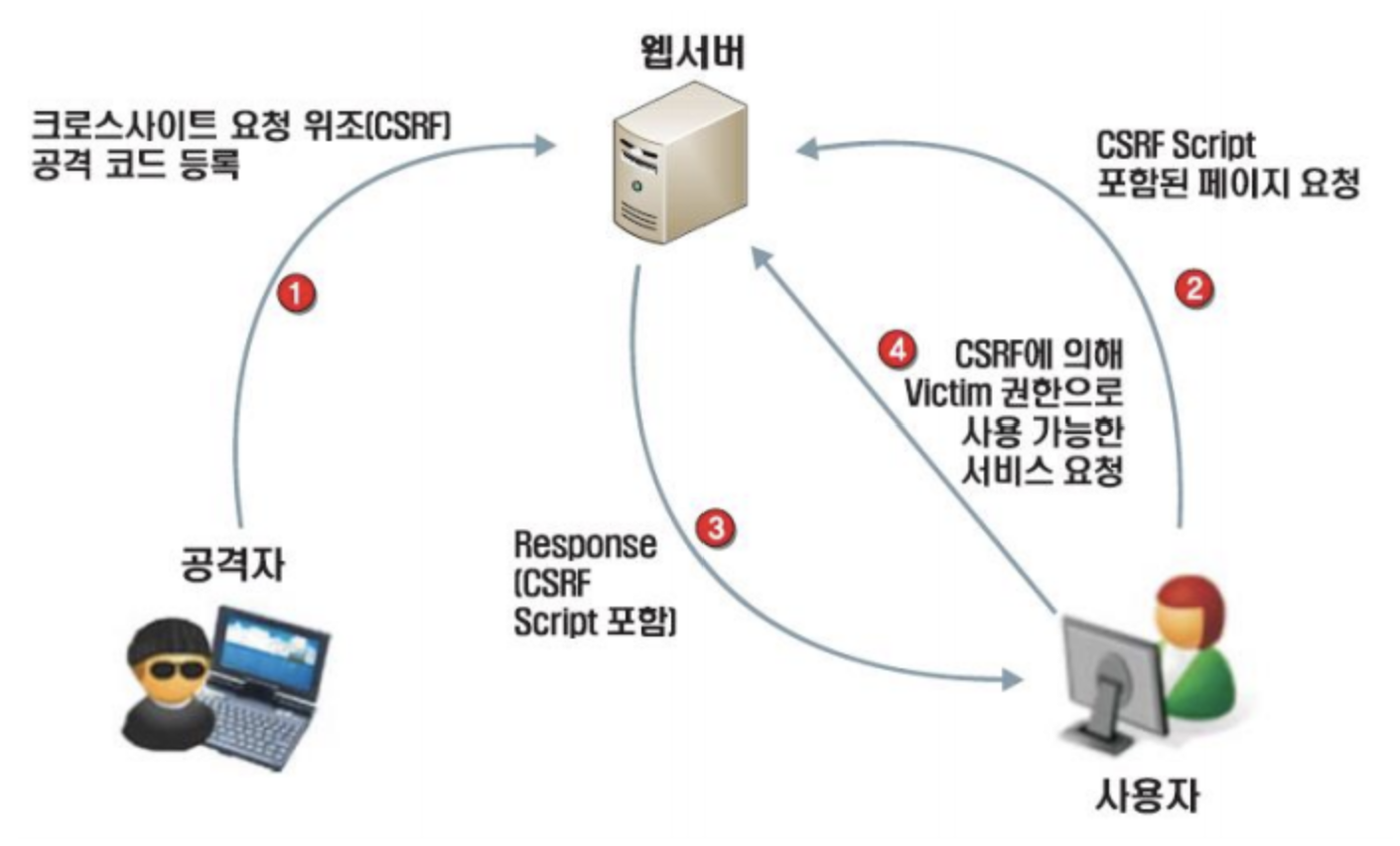 크로스 사이트 요청 위조(Cross Site Request Forgery, CSRF)는 서버가 실제 서비스 페이지를 통한 정상요청인지 확인하지 않고 처리하는 경우 악의적인 스크립트를 이용하여 다른 사용자의 권한으로 중요기능 실행, 패스워드 변경 등의 공격을 할 수 있는 취약점이다.