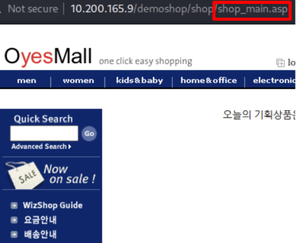 - 웹의 MAIN을 접근했을 때 MAIN을 구성하고 있는 웹의 확장자가 ASP인 것을 확인했다.