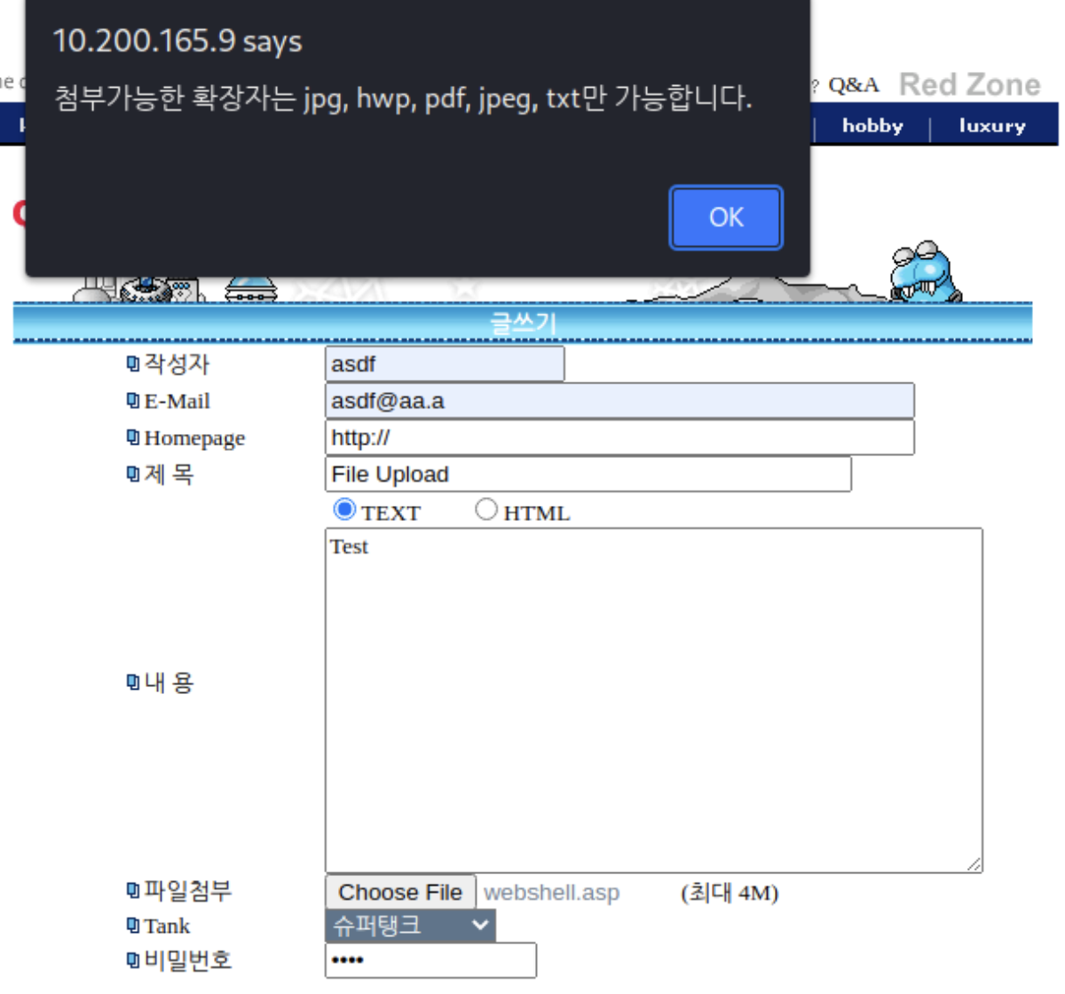 게시판에 접속하여 ASP확장자를 가진 웹 쉘을 업로드 해본다.