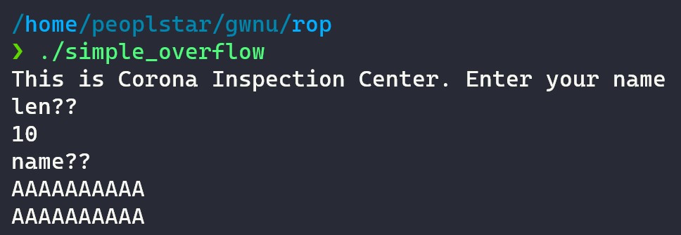 해당 문제는 리턴 지향 프로그래밍이라는 제목으로 Pwnable 카테고리로 나왔다. 따라서, 이 문제는 풀이 방식이 정해져 있음을 알고 해당 파일을 모두 받아왔습니다. 소스 코드 없이 실행 파일만 존재해 실행을 반복하면서 로직을 파악했습니다.