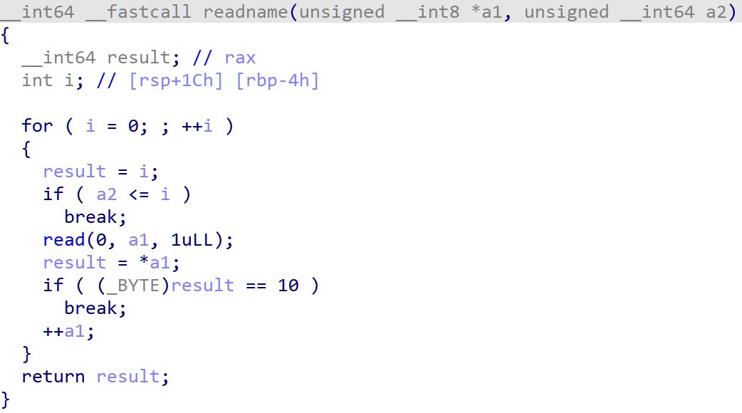 readname()를 통해 입력받을 name의 위치가[rbp-0x10]에 위치 -
