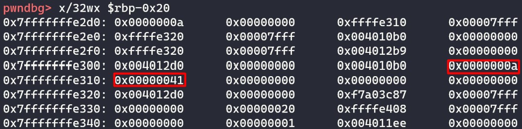readname의 read()에서 A를 넣고 값을 확인해보면 이 처럼 Main Stack에 입력 값이 들어가는 것을 알 수 있다.