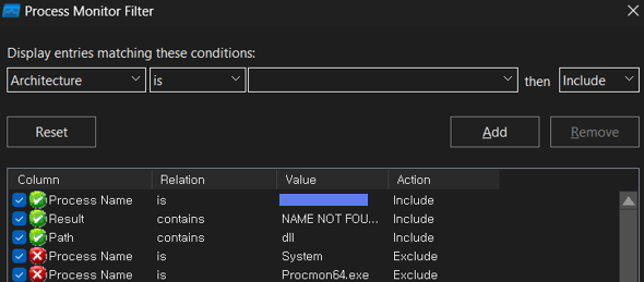 이 처럼 필터 기능을 활성화 시키고 타케팅했던 프로그램을 실행하게 되면 이렇게 제대로 참조하지 못하는 dll 파일들만 보여준다.