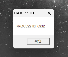 MessageBoxA(NULL, buf, "PROCESS ID", MB_OK); // 메세지 박스 생성