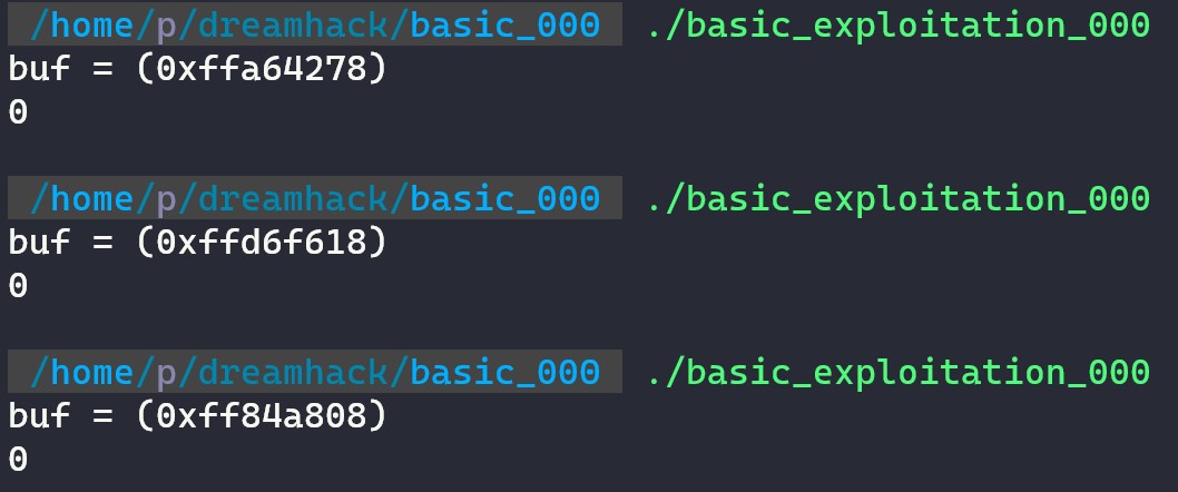 다운로드 파일을 실행해보면 Buf의 주소가 나오는데 아래처럼 계속 바뀌는 것을 알 수 있다.