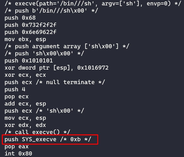 빨간 네모칸을 보면 SYS_execve를 하기 위해 0xb 값을 PUSH 한다. execve는 syscall로 11번이기에 0xb를 PUSH 해줘야 한다. 하지만 scanf는 \x09, \x0a, \x0b, \x0c, \x0d, \x20의 값을 읽게 되면 EOF를 선언해버리기 때문이다.
