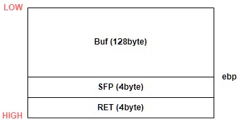 scanf를 진행하므로 결국 Buf는 128byte를 차지하며 141byte까지 입력이 가능하다. 이로써 BOF 풀이가 가능하다.