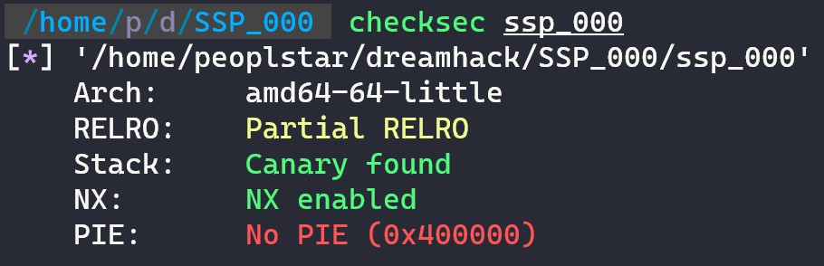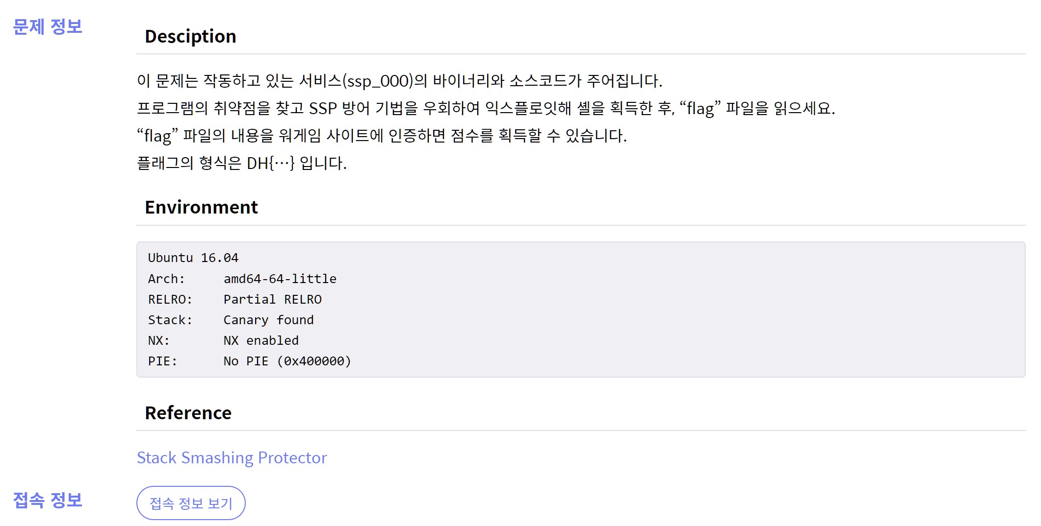 해당 문제는 Dreamhack Pwnable 교육과정 중 Stack Canary 실습 문제이다. 따라서 문제에서 요구하는 바는 SSP 방어 기법을 위해하여 flag를 획득하는 것이다.