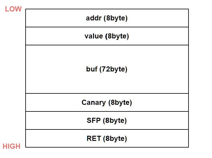 __stack_chk_fail@plt를 통해 GOT를 참조할 것이다. 따라서, 우리가 입력할 수 있는 addr를 __stack_chk_fail@got로 변경하고, 해당 내용을 get_shell로 변경하면 된다.(해당 루틴이 정확하게 어떻게 이루어지는지 더 공부해야할 것으로 보인다.)