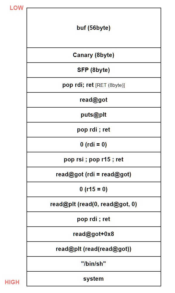 따라서, buf로부터 Canary 위치까지 입력하게 된다면 해당 값을 받아올 수 있다.