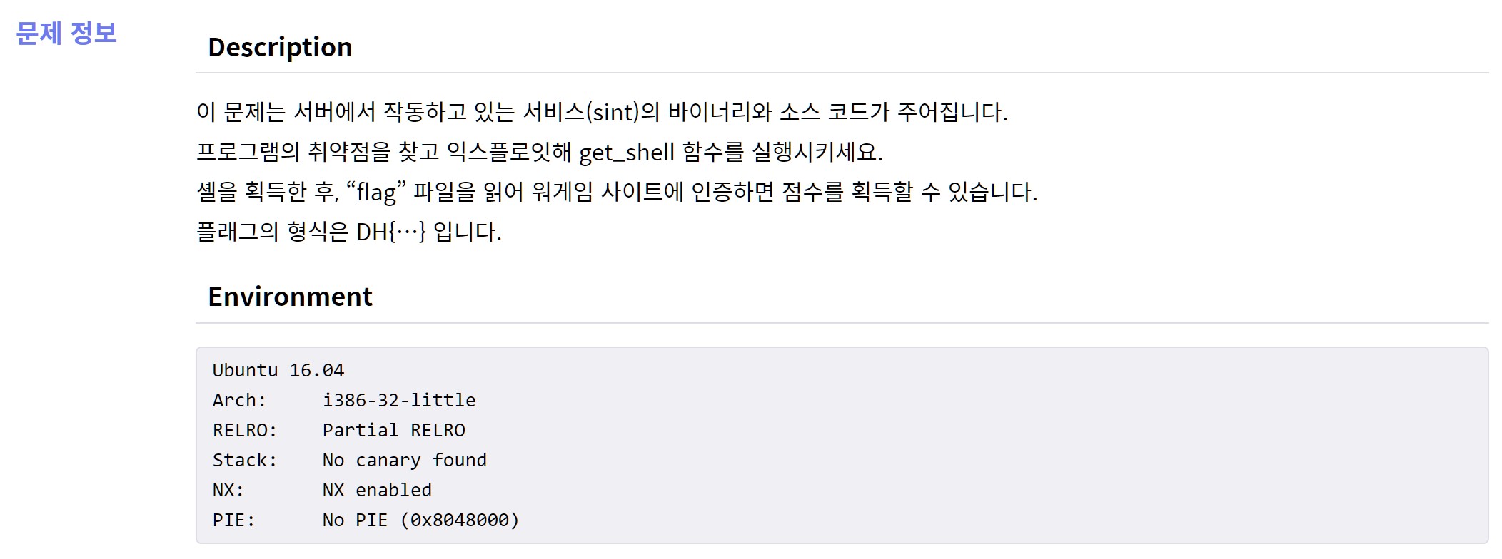 이 문제는 Integer Issues라 하는 Reference를 가지고 있고 보호기법으로 보면 NX bit만 활성화 되어 있는 것을 알 수 있다.