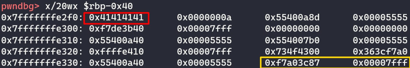 read(0, buf, 0x100);를 통해 AAAA를 대입한 값이 [rbp-0x40] 즉, buf의 위치가 된다. -