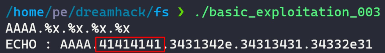 위처럼 AAAA.%x.%x.%x.%x.%x를 입력 했을 때이렇게 첫번째 %x 서식 문자에 우리가 입력한 AAAA를 인자로 받는 것을 알 수 있다.