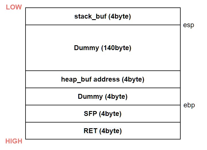 즉, stack_buf부터 RET까지는 총 156byte의 더미가 쌓이게 된다.