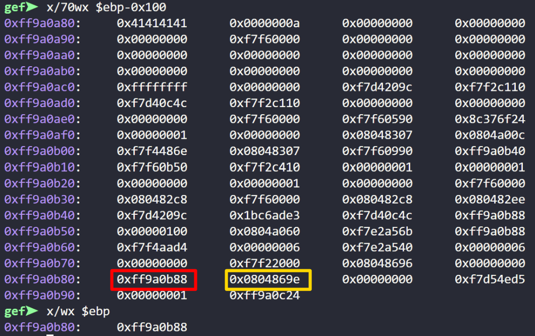 strcpy시 마지막 널 바이트가 포함되므로 cpy SFP는 0xff9a0b88가 아닌 0xff9a0b00이 된다.