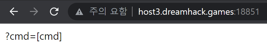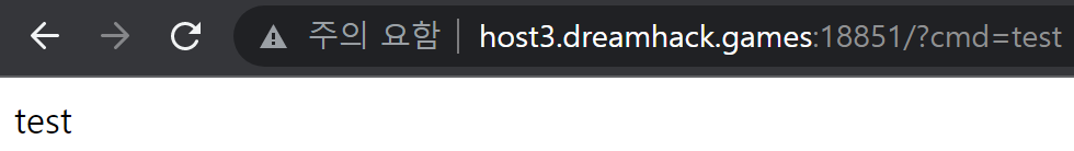 접속 시 ?cmd=[cmd]의 문자만 출력하고 있다. cmd라는 변수를 이용해서 GET 메소드로 입력 값을 받는 것처럼 보이기에 시도하면 아래와 같이 그대로 다시 출력한다.