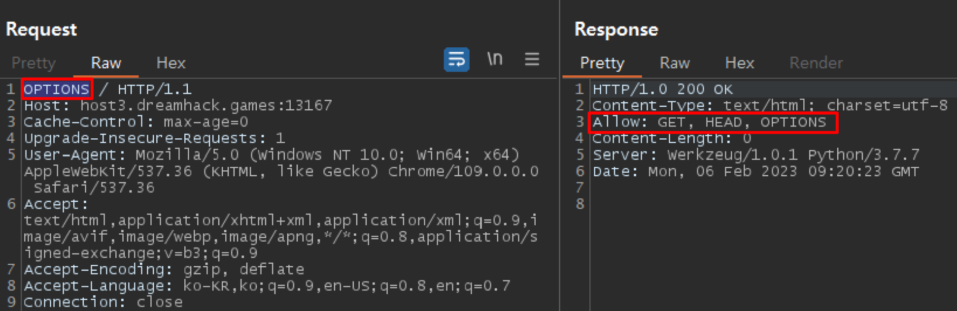 Burp Suite로 잡고 GET 메소드를 OPTIONS 메소드로 변경하면 허용중인 메소드의 종류가 나온다.
