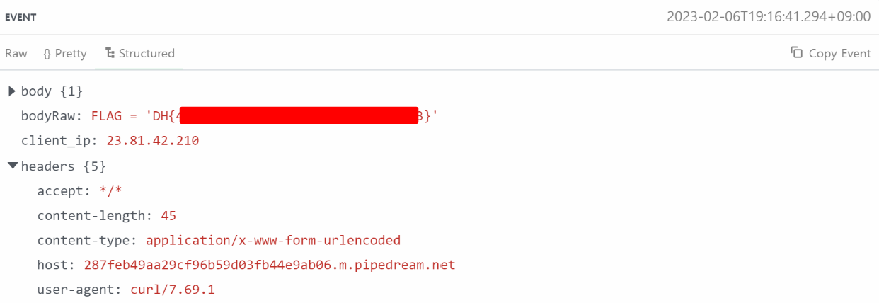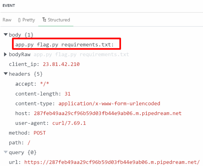 ls 명령어에 대한 이벤트 값이 app.py, flag.py, requirements.txt가 있는 것을 알 수 있고 flag.py를 cat으로 읽어보면 된다.