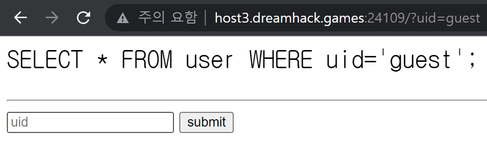 입력했던 값이 GET 메소드를 이용해 uid 변수에 들어가고 입력 값에 따라 쿼리도 변하는 것을 알 수 있습니다.