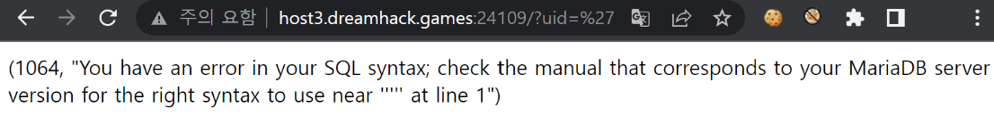 단순하게 ' 하나 대입하였을 때 쿼리에 대한 에러 내용을 출력해주는 것을 알 수 있다. 여기서는 MariaDB를 사용하고 있다는 정보를 얻을 수 있다.