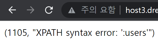 extractvalue : 첫 번째 인자로 전달된 XML 데이터에서 두 번째 인자인 XPATH 식을 통해 데이터를 추출합니다. 만약, 두 번째 인자가 올바르지 않은 XPATH 식일 경우 올바르지 않은 XPATH 식이라는 에러 메시지와 함께 잘못된 식을 출력합니다. 즉, 첫 번째 인자에 XPATH가 아닌 정수 값, 두 번째 인자에는 우리가 알고자 하는 값을 입력합니다.