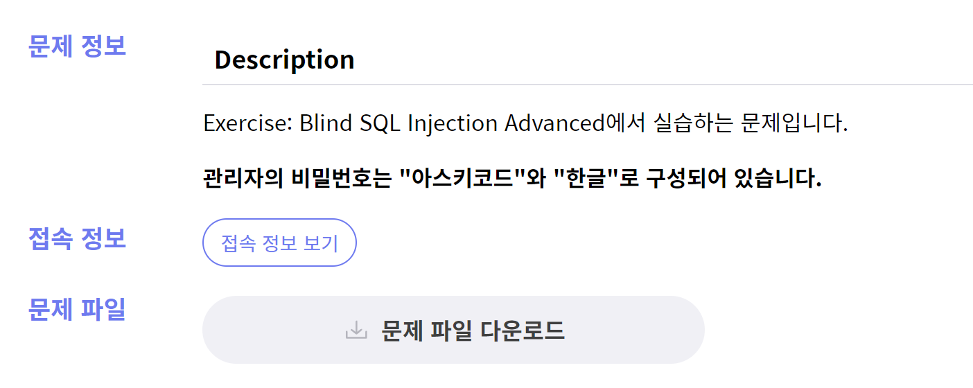 해당 문제는 SQL 심화 과정에 대한 문제입니다. Blind SQLi문제로 심화된 과정입니다. 관리자의 비밀번호는 아스키코드, 한글로 이루어져 있다보니 인코딩에 유의해서 해결해야합니다.
