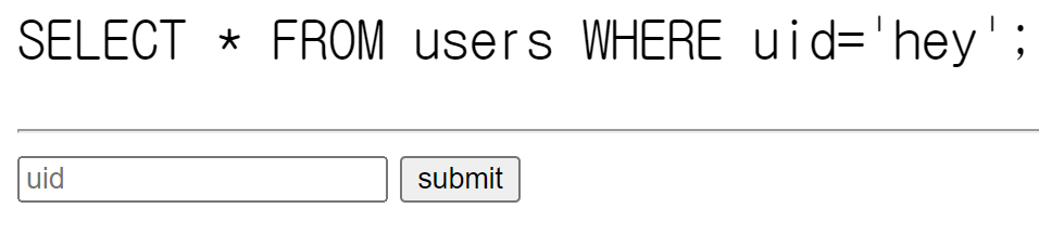 GET 메소드를 이용하고 uid 변수를 통해서 값을 받으면 쿼리를 진행하는데 해당 쿼리의 값이 1일 경우 <pre style="font-size:150%">user "" exists.</pre>를 보여주게 된다.