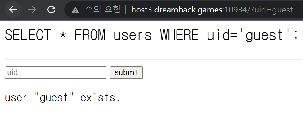 입력했던 값이 GET 메소드를 이용해 uid 변수에 들어가고 입력 값에 따라 쿼리도 변하는 것을 알 수 있습니다. 기존 DB에 guest라는 계정이 존재하면 아래처럼 user "guest" exists라는 문구가 나오는 것을 알 수 있습니다.