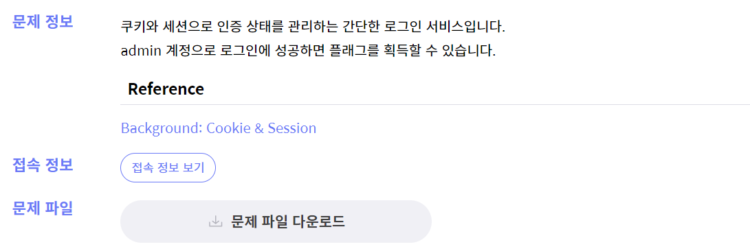 쿠키와 세션을 통해서 admin 계정으로 로그인에 성공하면 플래그를 획득한다는 것으로 보았을 때 세션쿠키값을 변조하여 admin으로 로그인하면 될 것으로 예상한다.