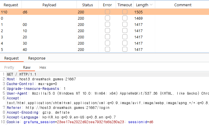 main 함수를 보면 admin 계정의 세션은 한 글자의 헥스 값(총 2글자)으로 이루어진 것을 알 수 있는데 0~9, A~F까지 모든 조합을 다 일일이 Brute Force 하기에는 불필요한 시간이 소요되기에 Burp Suite Intruder를 이용하겠습니다.