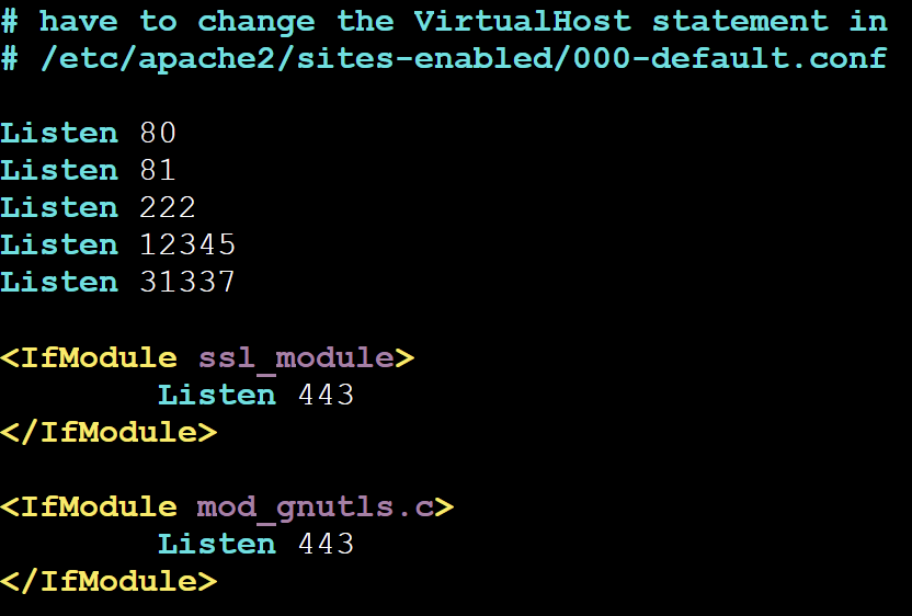 Listen ports_number를 사용할 포트로 추가하면 됩니다. 기본적으로 Listen 80만 적혀 있지만, 저는 여러 문제를 통해 접속을 받아야 하기에 81, 222, 12345, 31337 여러 포트를 열어뒀습니다.