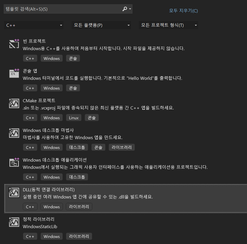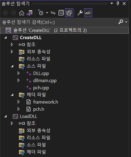 Visual Studio에서 프로젝트 생성 DLL(동적 연결 라이브러리) 를 선택하면 소스 파일에는 dllmain.cpp, pch.cpp, 헤더 파일에는 framework.h, pch.h가 존재합니다.