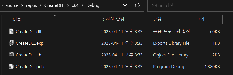 해당 내용을 적고 컴파일(Ctrl + F7), 디버그 하지 않고 시작(Ctrl + F5) 이후 해당 프로젝트 내에 Debug 디렉토리로 가면 아래처럼 dll파일이 생성된 것을 확인할 수 있습니다.