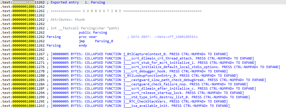 extern "C" __declspec(dllexport) int Parsing(char* path) {