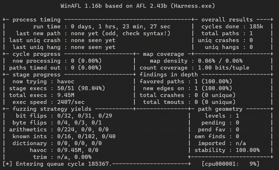 afl-fuzz.exe -i ./afl_in -o ./afl_out -D C:/_fuzz/DynamoRIO-Windows-9.0.1/bin64 -t 10000+ -- -coverage_module %TargetDLL% -target_module Harness.exe -target_method fuzz_me -fuzz_iterations 5000 -nargs 1 -- %HarnessFilePath% \@@