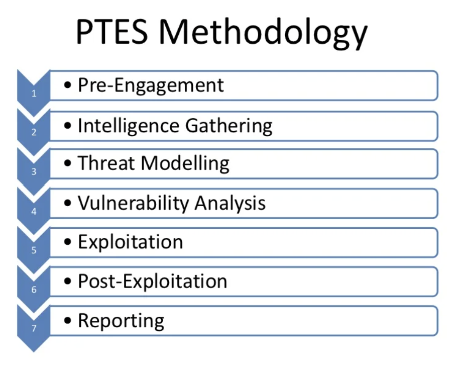 PTES(Penetration Testing Execution Standard) : 모의해킹을 체계화된 방법으로 수행하기 위해 만든 표준. 7단계로 구성되어 있다.