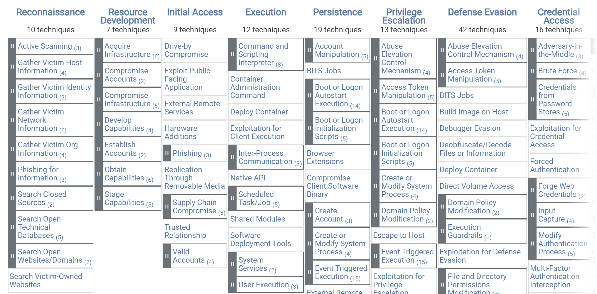 Matrix For Enterprise(22/05/02 기준)으로 전략(Tactics) 14개, 전술(Techniques) 222개가 존재한다.