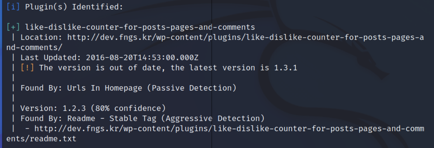 wpscan -v dev.fngs.kr- 자세한 출력으로 해당 플러그인에 대한 설명이 포함됩니다.