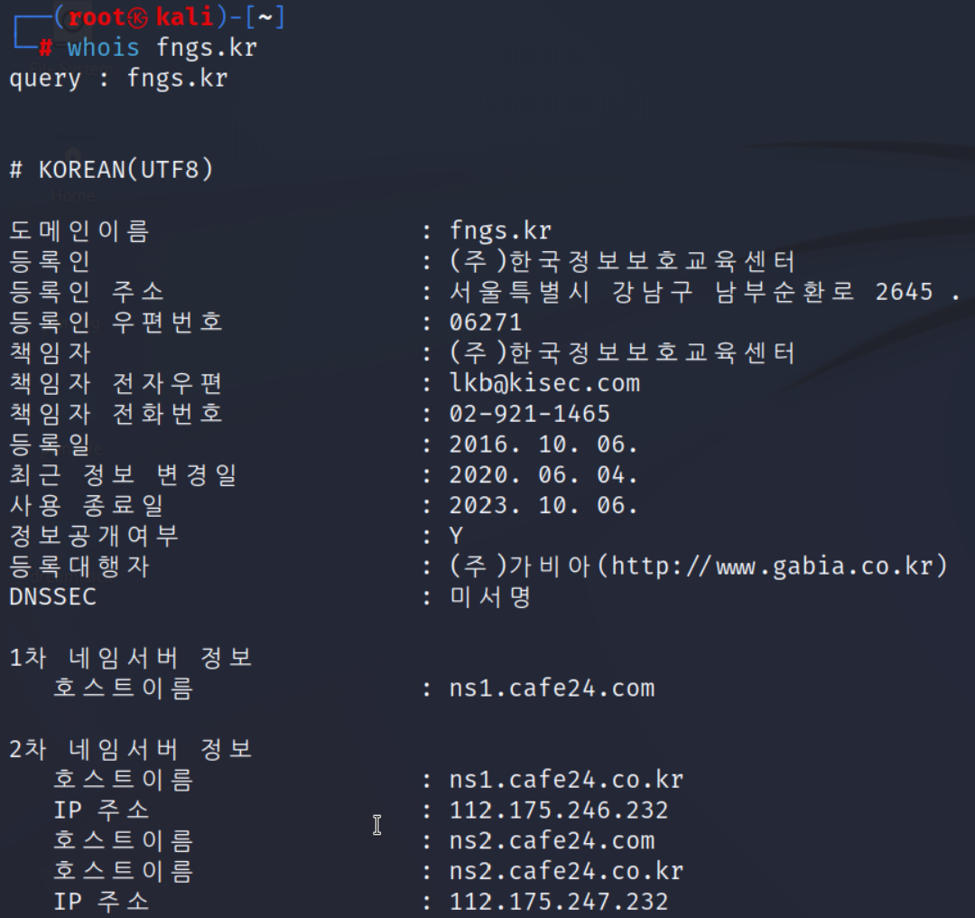 whois fngs.kr- Domain 등록 정보와 해당 네임 서버를 출력한다.