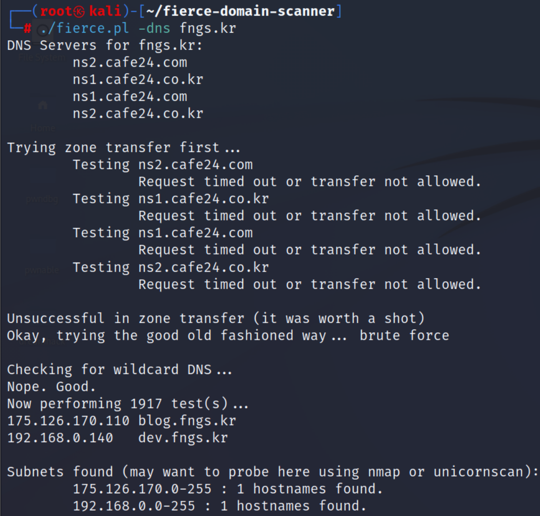 fierce -dns fngs.kr- fierce는 최신 버전 칼리 리눅스에서는