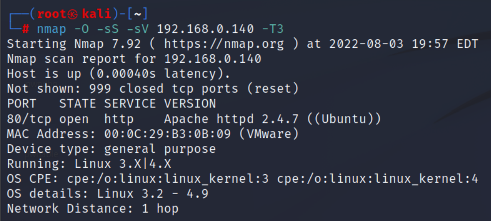 nmap -O -sS -V 192.168.0.140 -T3- -O : 운영체제에 대한 정보를 추정