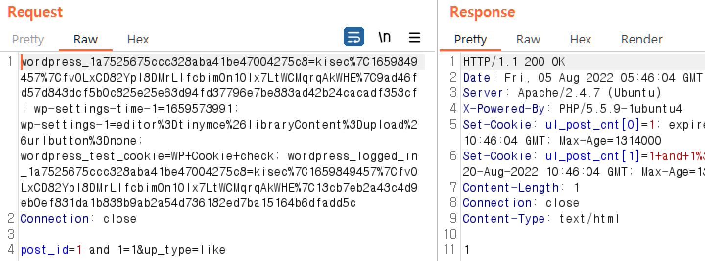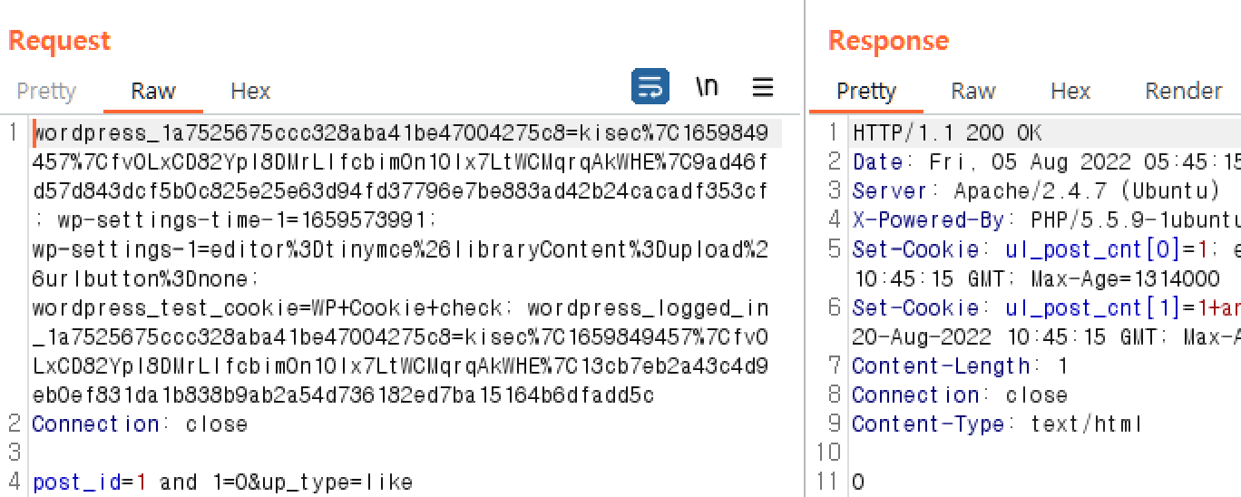 Like 버튼 클릭 했을 때 발생하는 패킷입니다. 파라미터는 post_id와 up_type으로 Burp Suite 옵션 Repeater를 사용해보겠습니다.